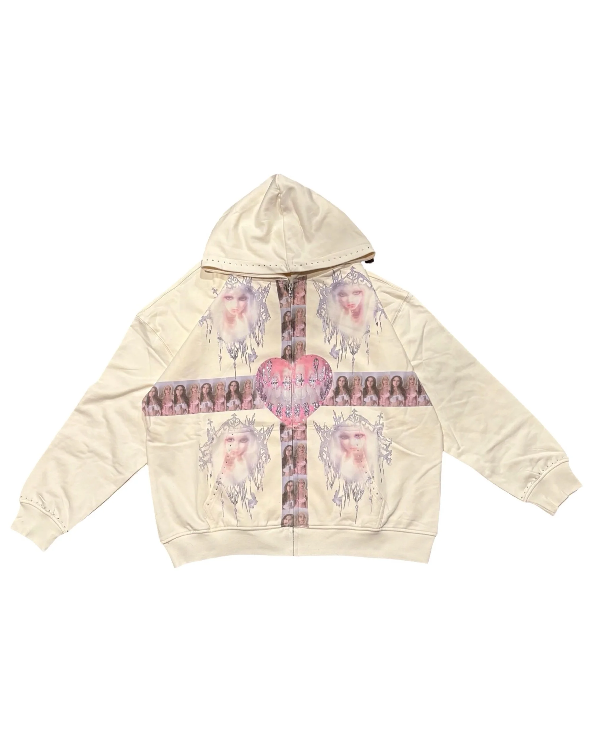 400 gsm French terry cotton with a stainless steel YKK zipper. Features a DTG print embellished with rhinestones across the hood, cuffs, pockets, and artwork. Only 30 made.